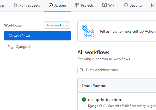 - github에서 action탭을 누르면 action이 활성화됨을 볼 수 있다.